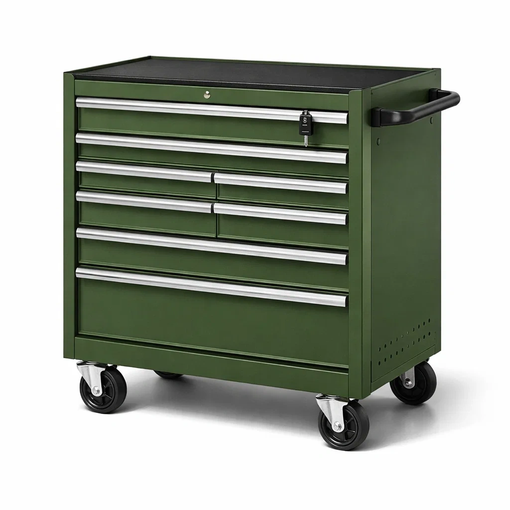 Ce chariot à outils est fabriqué en acier avec une finition en peinture en poudre verte. Il possède 7 tiroirs coulissants et des roulettes pivotantes pour une mobilité aisée. Le chariot est équipé d'une serrure à clé pour sécuriser vos outils.